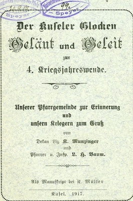 "Der Kuseler Glocken Geläut und Geleit zur 4. Kriegsjahreswende. Unserer Pfarrgemeinde zur Erinnerung und unsern Kriegern zum Gruß von Dekan Liz. K. Munzinger und Pfarrer u. Insp. L. H. Baum. Als Manuskript bei K. Müller, Kusel 1917", 30 Seiten; Innen handschriftlich: "Der Kriegssammlung des Hist. Museums der Pfalz zugeeignet von Pfr. Baum"; Druck von Karl Müller, Kusel