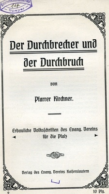 "Der Durchbrecher und der Durchbruch, von Pfarrer Kirchner (Erbauliche Volksschriften des Evang. Vereins für die Pfalz 2)" (ca. 1915/16), 8 Seiten; Verlag des Evang. Vereins Kaiserslautern
