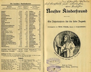 Neuster Kinderfreund. Ein Jahrbüchlein für die liebe Jugend. Herausgegeben von Herm. Schultz, Pfarrer in Kirchheimbolanden, 1917 (?), 64 Seiten; Innen handschriftlich: "Dem Historischen Museum für die Kriegssammlung freundlich überlassen vom Verfasser"; Druck und Verlag: Evangelischer Verlag, Heidelberg