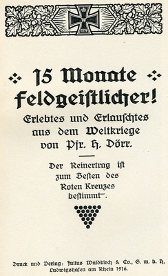 15 Monate Feldgeistlicher! Erlebtes und Erlauschtes aus dem Weltkriege von Pfr. H. Dörr, (1916), 60 Seiten; Druck u. Verlag: Julius Waldkirch & Co., GmbH, Ludwigshafen am Rhein 1916