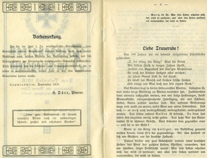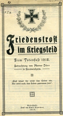 "Friedenstrost im Kriegsleid. Zum Totenfest 1918. Betrachtung von Pfarrer Dörr in Laumersheim", 7 Seiten; Handschriftl: "Ergebenst überreicht v. Verf.!"; Druck von Emil Sommer, Grünstadt 1918