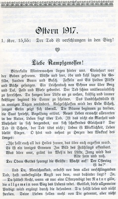 "Das Leben ist doch stärker als der Tod! Ostergruß an die Kämpfer draußen und daheim. 1917. Von Pfarrer Dörr, Laumersheim (Pfalz), 7 Seiten."; Innen handschriftl.: "Freiexemplar"; Druck von F. Ch. Riedel & Cie, 1917