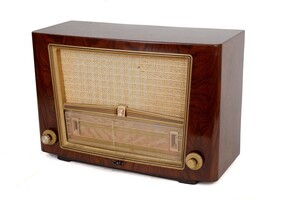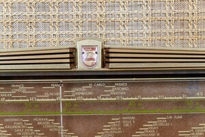 1953 und 1954 wurde dieser Philips Empfänger in Eindhofen/Holland hergestellt. Das Gehäuse besteht aus dunkelbraun marmoriertem Bakelit. Die Lautsprecherbespannung und das Bedienteil sind von einem goldfarbenen Rahmen eingefasst. Gesteuert wir das Radio ausschließlich über zwei Drehregler, die an der Frontseite angebracht sind. Ein Magisches Auge hilft bei der Aussteuerung der Sender. Die Wellenbereiche - MW/LW/ 2 x KW sind als Ziffern angegeben, die sich auf der Senderskala wiederholen. Rückseitig sind die Anschlüsse für Plattenspieler, Zweitlautsprecher, Antenne und Erde eingebaut. Alle Verbindungen erfolgenmit Bananensteckern.