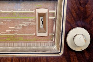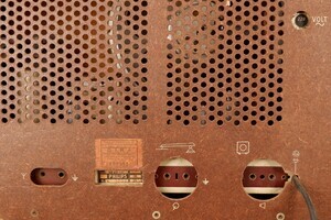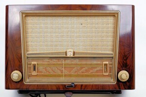 1953 und 1954 wurde dieser Philips Empfänger in Eindhofen/Holland hergestellt. Das Gehäuse besteht aus dunkelbraun marmoriertem Bakelit. Die Lautsprecherbespannung und das Bedienteil sind von einem goldfarbenen Rahmen eingefasst. Gesteuert wir das Radio ausschließlich über zwei Drehregler, die an der Frontseite angebracht sind. Ein Magisches Auge hilft bei der Aussteuerung der Sender. Die Wellenbereiche - MW/LW/ 2 x KW sind als Ziffern angegeben, die sich auf der Senderskala wiederholen. Rückseitig sind die Anschlüsse für Plattenspieler, Zweitlautsprecher, Antenne und Erde eingebaut. Alle Verbindungen erfolgenmit Bananensteckern.