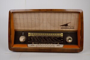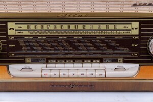 Ein großes Tischgerät der Firma Loewe-Opta von 1958. Das Gerät ist als Stereo Empfänger konzipiert und ist mit 4 Lautsprechern ausgestattet. Das Holzgehäuse ist zwei farbig funiert und hochglanz poliert. Die Ecken sind abgerundet, wodurch ein gefälliges Aussehen erreicht wurde. Die Entwicker haben dem Radio ein üppiges Bedienfeld spendiert mit immer hin mit 13 Drucktasten. Sie stehen für die Wahl der Wellenbereiche MW/LW/KW/UKW, der Zuschaltung von Plattenspieler und Tonbandgerät sowie dem Ausschalten. Oberhalb dieser Tasten sind 6 Kleinere angeordnet, die vorwiegend diverser Klangeinstellungen, einschl. Stereo, dienen. Die beiden großen Drehregler dienen der Lautstärke, der Senderwahl und der Ferrit Antenne. Auf der Rückseite gibt es Anschlüsse für Plattenspieler, Tonbandgerät und Zweitlautsprecher für Stereo Betrieb. Das Radio lässt sich zwar einschalten, brummt aber nur.