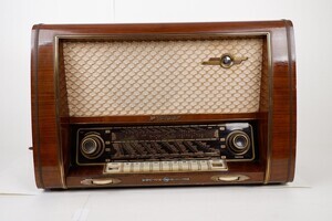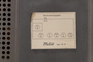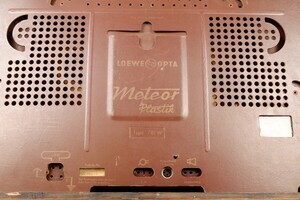 Ein typisches Modell der 50er Jahre. Loewe Opta stelle den Meteor Plastik 781W in den Jahren 1955 und 1956 her. Der Begriff "Plastik" im Namen bezieht sich auf den 3D-Klang und nicht auf den Werkstoff des Gehäuses. Die geschwungenen Linien, des in hochglanz, dunkelbraun furnierten Gehäuses bestimmen das Äußerliche. Die Front ist, wie üblich, horizontal geteilt. Im oberen Bereich, hinter einer hellen Stoffabdeckung, der Hauptlautsprecher und ein magisches Auge. (eine optische Hilfe zur Feinabstimmung der Sender) Seitlich ist jeweils ein zusätzlicher Lautsprecher eingebaut, zur Betonung des "3D-Klang" , mit dem die Firma Grundig großen Erfolg hatte. Im unteren Bereich der Front befindet sich die Sendeskala, die Drucktasten und Drehregler zur Bedienung des Radios. Im unteren Bereich des Gehäuses sind zwei, waagerecht eingebaute Drehregler, zur Klangoptimierung von Höhen und Tiefen. Mit den großen Drehreglern, neben der Senderskala, werden die Abstimmung (Senderwahl), die Peilung Ferritantenne, und Laut/Leise ausgewählt. Auf der Rückseite sind Anschlüsse für Plattenspieler, Lautsprecher, UKW Antenne und ein Diodenstecker für Tonband eingebaut. Letzterer ist nur als Ausgang vom Radio zum Tonband nutzbar. Auf der Innenseite der Rückwand ist die Röhrenbestückung eingeklebt. Im Radioladen kostete 1955 das Gerät 320 DM. Heute gibt es leider keinen Ton mehr von sich.