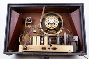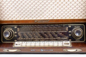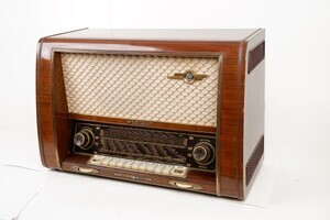Ein typisches Modell der 50er Jahre. Loewe Opta stelle den Meteor Plastik 781W in den Jahren 1955 und 1956 her. Der Begriff "Plastik" im Namen bezieht sich auf den 3D-Klang und nicht auf den Werkstoff des Gehäuses. Die geschwungenen Linien, des in hochglanz, dunkelbraun furnierten Gehäuses bestimmen das Äußerliche. Die Front ist, wie üblich, horizontal geteilt. Im oberen Bereich, hinter einer hellen Stoffabdeckung, der Hauptlautsprecher und ein magisches Auge. (eine optische Hilfe zur Feinabstimmung der Sender) Seitlich ist jeweils ein zusätzlicher Lautsprecher eingebaut, zur Betonung des "3D-Klang" , mit dem die Firma Grundig großen Erfolg hatte. Im unteren Bereich der Front befindet sich die Sendeskala, die Drucktasten und Drehregler zur Bedienung des Radios. Im unteren Bereich des Gehäuses sind zwei, waagerecht eingebaute Drehregler, zur Klangoptimierung von Höhen und Tiefen. Mit den großen Drehreglern, neben der Senderskala, werden die Abstimmung (Senderwahl), die Peilung Ferritantenne, und Laut/Leise ausgewählt. Auf der Rückseite sind Anschlüsse für Plattenspieler, Lautsprecher, UKW Antenne und ein Diodenstecker für Tonband eingebaut. Letzterer ist nur als Ausgang vom Radio zum Tonband nutzbar. Auf der Innenseite der Rückwand ist die Röhrenbestückung eingeklebt. Im Radioladen kostete 1955 das Gerät 320 DM. Heute gibt es leider keinen Ton mehr von sich.