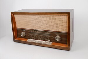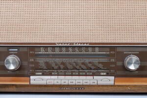 Großes Stereo Tischgerät aus den Jahr 1962-1963 mit 4 eingebauten Lautsprechern. Das Holzgehäuse ist zweifach, hell/dunkel furniert und hochglanz poliert. Das sehr üppig ausgestaltete Bedienfeld verfügt über insgesamt 13 Drucktasten. Zur Wahl stehen die Wellenbereiche LW/MW/KW/UKW sowie externen Geräte. (Plattenspieler, Tonband etc.) Mit den beiden, großen Drehreglern, können die Lautstärke, die Senderwahl, die Ferritantenne und das Klangbild beeinflusst werden. Rückseitig sind Anschlüsse für Zweitlautsprecher (Stereo), Plattenspieler und Tonband sowie für die eingebaute bzw. externe UKW Antenne vorhanden. Das Radio kostete im Fachhandel 529 DM
