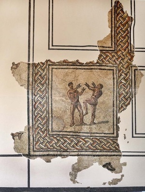 Dieser nur fragmentarisch erhaltene Mosaikboden zeigt ein Paar vollkommen unbekleidete Faustkämpfer (pugiles). Beide tragen um Hand und Unterarm gewickelte Schlagriemen, deren Enden mit Dornen bestückt sind und schwere Verletzungen bewirken können. So traten die Kämpfer damals im Amphitheater gegeneinander an, gekämpft wurde so lang bis einer der beiden Gegner kampfunfähig war. Um das Bildfeld herum sind verschlungene Verzierungen (Flechtbänder) zu sehen.
