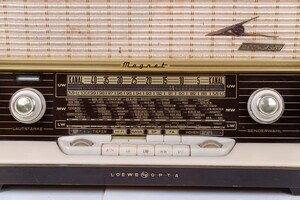 Das Modell Magnet 3737W von Loewe Opta ist ein mittelgroßes Tischgerät, gebaut in den Jahren 1958 - 1959. Während das Chassis rundum aus Holz, dunkel funiert, gefertigt wurde, umschließt die Vorderfront ein Rahmen aus elfenbeinfarbenen Bakelit. Ausgestattet ist der Empfänger mit einem Haupt- und zwei kleinen Lautsprechern, die seitlich abstrahlen. Für die Bedienung stehen insgesamt 9 Drucktasten zur Verfügung. Mit ihnen lassen sich die Wellenbereiche LW/MW/LW/UKW anwählen, der Plattenspieler und das Gerät ausschalten. Weitere Tasten dienen der Klangeinstellung und der Feritantenne. Zu unserer Freude läuft das Radio auf UKW einwandfrei. Der Ladenpreis lag 1858 bei 289 DM