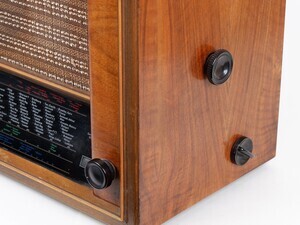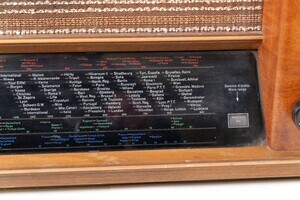 Ein Tischmodell Typ "Favorit WK" der Firma Saba aus dem Jahr 1948. Das Gehäuse ist aufwändig gearbeitet und hat eine klare, kantige Form. Ausgestattet ist das Gerät mit LW/MW und zwei Kurzwellenbänder, die über einen seitlich angebrachten Drehregler angewählt werden. Der zweite seitliche Regler ist für die Senderabstimmung vorgesehen. Die Scheibe der Senderskala ist dunkel gehalten, so dass die in Farbe aufgedruckten Sender und Wellenbereiche gut zu erkennen sind. Durch ein kleines Sichtfenster ist der gewählte Wellenbereich erkennbar. Angeschlussmöglichkeiten gibt es für Plattenspieler und externe Lautsprecher. Irgendwann war das Gerät in Reparatur. Ein Aufkleber nennt das "Elektrohaus Thomas, Trier, Paulinstrasse 26/28" als Reparatur Betrieb.