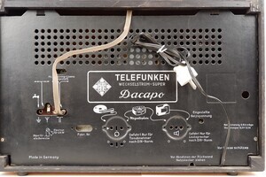Das Tischgerät Dacapo von Telefunken stammt aus den Jahren 1952. Es wurde mit Bakelit und mit Holzgehäuse hergestellt. Unser Gerät ist aus Holz, ist dunkel furniert und für das Alter noch recht gut erhalten. Im Bereich des Lautsprechers ist das „Magisches Auge“ angebracht, ebenso das Firmenlogo mit der Typangabe ""Dacapo"" Mit den beiden Drehknöpfe auf der Vorderseite lassen sich die Sender auswählen, die Lautstärke einstellen und das Gerät Ein- bzw. Ausschalten. An der rechten Seitenwand sitzt der Drehschalter, mit dem Sender der Mittelwelle, Kurzwelle und UKW eingestellt werden können. Mit den gleichen Schalter kann auch der Plattenspieler oder Tonband verbunden werden. Auf der Rückseite sind Anschlüsse für Plattenspieler, Tonband und Zweitlautsprecher vorhanden sowie für Antenne, Erde und die eingebaute UKW Antenne. Im Einzelhandel kostete Das Radio 258 DM im Jahr 1952.