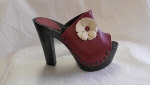 Ein einzelner Kinder-Clog aus braunem Leder. Eckige Form. Sohle, Absatz (ca. 3,5cm) und das Plateau (ca. 2,5cm) bestehen aus einem Stück Holz. Das Obermaterial ist an die Sohle genietet. Der Schuh verfügt über eine Mittelnaht. Hergestellt von der Firma Peha in Italien. Datiert auf die 1970er Jahre.