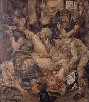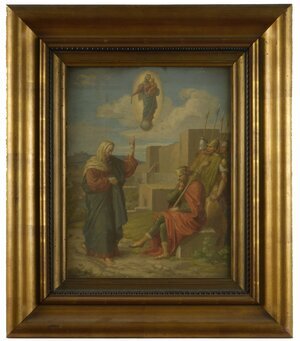 Die heilige Pelagia führte zunächst ein lasterhaftes Leben als Tänzerin. Die Predigt eines Bischofs soll sie aber bekehrt haben. Sie hat sich taufen lassen, sich in Männerkleider gehüllt und am Ölberg bei Jerusalem ein strenges Büßerleben geführt. Bei ihrem Tod 457 entdeckte man, dass der verehrte Einsiedler eine Frau war. Philippe de Champaigne hat es künstlerisch vermocht, zwei Darstellungen miteinander zu verbinden: Die unsinnliche, karge und büßergerechte Wüstenei im Vordergrund mit der dem klassischen Flair im Hintergrund. Die Darstellung von Jerusalem links im Bild geht auf die Vorlage aus einem Buch zurück. Das Bild ist über drei Mal zwei Meter groß. Es schmückte einst die Gemächer der französischen Königin Anna von Österreich, der Mutter Ludwigs des XIV., in der Abtei Val-de-Grâce bei Paris. Nach der Revolution wurde es dort entfernt und 1803 kam es mit 20 weiteren Gemälden in eine riesige Kiste, um von Frankreich nach Mainz gebracht zu werden. Dieses Ungetüm fiel in Metz beim Umladen auf das Schiff in die Mosel. Erst in Mainz wurde die Kiste wieder geöffnet. Zahlreiche Bilder waren von dem eingelaufenen Wasser beschädigt. Zudem hatte das Wasser Flusssand zwischen die Gemälde gespült, der dann auf dem Transport fleißig an der Farbe rieb. Der folgende Zustandsbericht zählte dieses Bild aber zu den weniger beschädigten. Kurz und bündig hieß es: "Der Rand…, der zu lange durchnässt war, ist verrottet und die Farben fallen ab." Sprecherin Inzwischen ist das Gemälde mehrfach restauriert worden.