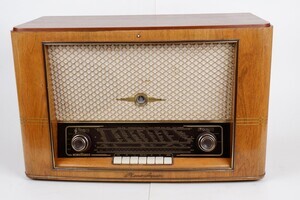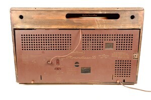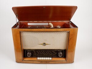 Ein kombiniertes Tischgerät. Radio mit eingebautem Plattenspieler. Produziert unter der Nummer 300 154 von Nord Mende in den Jahren1954/1955. Das Chassis ist vollständig aus Holz und mittelbraun furniert. Nach dem öffnen des Deckels, kann der eingebaute Plattenspieler von P & E (Perpetuum Ebner 3420PE) bedient werden. Die Vorderfront des Empfängers ist horizontal, im Verhältnis 1/3 zu 2/3 zu Gunsten des Lautsprechers, geteilt. Im Bedienelement dominieren 2 große Drehregler, mit einer 3fach bzw. 2fach Funktion. So wird mit dem linken Regler die Peilantenne, der Höhenregler und die Lautstärke bedient, mit dem rechten Regler, die Abstimmung und der Bass. Die sieben Drucktasten schalten die Wellenbereiche MW/LW/KW/UKW, die Peilantennne, den Tonabnehmen und das Aus. Eine Besonderheit bietet die Rückseite. Alle Buchsen für externe Anschlüsse sind fest mit der Rückwand verlötet. Ausnahme: die Dipol Antenne für UKW. Leider ist die Sicherung durchgebrannt, so dass die Funktion nicht geprüft werden konnte. Ein Original Schaltplan ist im Innern des Radios erhalten geblieben. (siehe Foto) Der Preis im Ladengeschäft lag bei 475 DM.