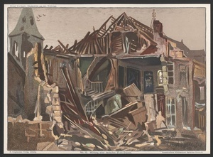 Kunstdruck mit dem Titel: "Wirkung einer deutschen 21-cm-Granate"; Künster: Ernst Vollbehr; das Blatt ist Bestandteil einer Mappe von 18 Kunstdrucken mit dem Titel "Künstlerbilder aus dem Weltkriege. An der Westfront vor dem Feinde gemalt, von Ernst Vollbehr, Kriegs- und Kolonialmaler. Farbige Künstlerlithographien nach den Vollbehrschen Studien, ausgeführt in der Kunstdruckerei Künstlerbund, GmbH in Karlsruhe", herausgegeben von R. Voigtländers Verlag, Leipzig