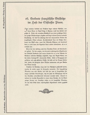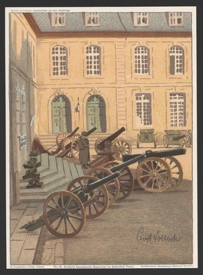 Kunstdruck mit dem Titel: "Eroberte französische Geschütze im Schlosshof Pinon"; Künster: Ernst Vollbehr; das Blatt ist Bestandteil einer Mappe von 18 Kunstdrucken mit dem Titel "Künstlerbilder aus dem Weltkriege. An der Westfront vor dem Feinde gemalt, von Ernst Vollbehr, Kriegs- und Kolonialmaler. Farbige Künstlerlithographien nach den Vollbehrschen Studien, ausgeführt in der Kunstdruckerei Künstlerbund, GmbH in Karlsruhe", herausgegeben von R. Voigtländers Verlag, Leipzig