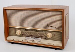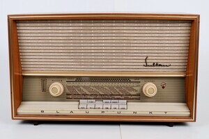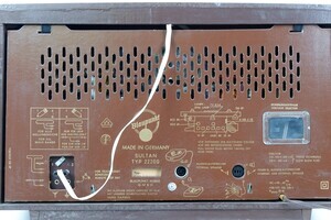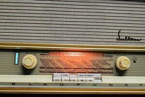 Nach der Produktion von Telefonen, verlegt die Firma Ideal das Hauptgewicht auf die junge Rundfunkindustrie. In der Vergangenheit erhielten Produkte von besonders hoher Qualität, als Prüfzeichen, einem blauen Punkt. Daraus wurde die Marke „Ideal Blaupunkt.“ Später wurde als Marke nur noch der Begriff „Blaupunkt“ verwendet. Unser Blaupunkt Radio stammt aus den Jahren 1962 / 1963. Das Gehäuse ist aus Holz und mittelbraun furniert. Auf der Stoffbespannung brilliert der Name "Sultan". Die Bedienelemente, einschließlich der Senderskala sind in einem elfenbeinfarbenen Ton gehalten. Drehregler und der Bereich der Drucktasten wurden in hellem Bakelit gefertigt. Das Gerät verfügt über die Wellenbereiche MW/LW/KW und UKW. 4 kleinere Drucktasten dienen der Klangverbesserung bzw. der Wahl spezifischer Einstellungen wie Sonor, Solo oder HiFi Klang. Im Innern ist ein Hauptlausprecher und zwei Kleinere verbaut, die seitlich angeordnet sind. So soll der HiFi Klang besonders gut zur geltung kommen. Bis auf ein leichtes Kratzen beim Verändern der Lautstärke funktioniert UKW gut. Auf der Rückseite sind mehrere techn. Details aufgedruckt, u.a. auch der Röhrenplan. Anschlüsse für Tonband, Plattenspieler und Zweitlautsprecher sind ebenfalls vorhanden. Lt. Preisliste kostete das Radio ehemals 315 DM