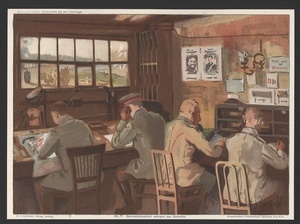 Kunstdruck mit dem Titel: "Generalstabsarbeit während des Gefechts"; Künster: Ernst Vollbehr; das Blatt ist Bestandteil einer Mappe von 18 Kunstdrucken mit dem Titel "Künstlerbilder aus dem Weltkriege. An der Westfront vor dem Feinde gemalt, von Ernst Vollbehr, Kriegs- und Kolonialmaler. Farbige Künstlerlithographien nach den Vollbehrschen Studien, ausgeführt in der Kunstdruckerei Künstlerbund, GmbH in Karlsruhe", herausgegeben von R. Voigtländers Verlag, Leipzig