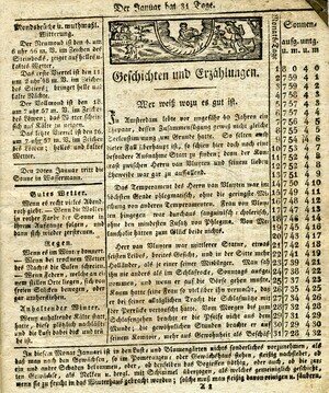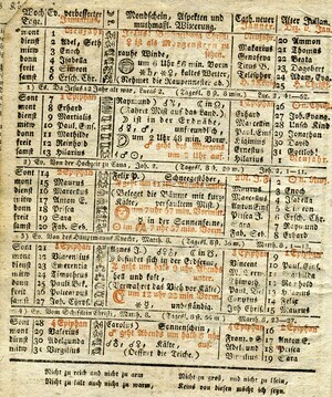 Holzschnitt des Hinkenden Boten beim Überbringen der Nachrichten: Rechts ist der titelgebende hinkende Bote zu sehen. In Militärtracht, Lanze in der einen, Brief in der anderen Hand. Zu seinen Füßen die seine Langsamkeit symbolisierende Schnecke. Den Brief hält er in Richtung drei vornehm gekleideter Personen. Im Hintergrund sind Felder und Schiffe zu sehen. Über der Szene schwebt ein Posaune spielender Engel der in der linken Hand ein rundes Schild mit der Aufschrift „Der hinkende Bott“ trägt. Aus der Posaune heraus weht ein Banner mit der Jahreszahl. 32 Blätter, gedruckt von C. L. Rost, Zweibrücken. Tabelle zu den verschiedenen Zeitrechnungssystemen (gregorianisch, jüdisch), Aufschlüsselung der verwendeten Symbole, Auflistung verschiedenster in der Vergangenheit liegender Ereignisse, Daten zu Sonnen- und Mond- Auf- bzw. Untergang, Finsternissen und Besonderheiten der Planeten, astrologische Praktika für das Jahr, Monatsseiten, Ratschläge zur Gartenarbeit und Leerseiten für persönliche Eintragungen. Genealogie des königlichen Hauses Bayern.