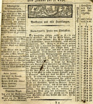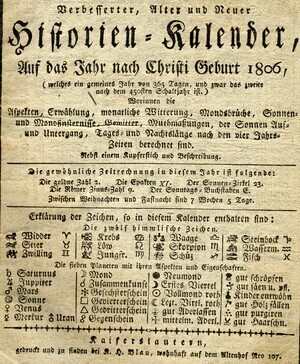 Kalender und Almanache waren bis zum 19. Jh. ein populäres Lektüremedium für breite Bevölkerungsschichten. Der Kaiserslauterner "Lustige Zeit-Vertreiber" oder auch "Verbesserter, Alter und Neuer Historien-Kalender" wurde von Karl Heinrich Blau (1757-1824) verlegt, der 1802 die erste Druckerei in der Stadt eröffnete. Wie bei Volkskalendern üblich, enthält der Lustige Zeitvertreiber einen Kalender nach verschiedenen Zeitrechnungen und so genannte astrologische Praktika (auf Astrologie beruhende Wettervorhersagen), Anweisungen zum Aderlass, Termine für Messen und Märkte in der Region, Anekdoten, historische Begebenheiten und politische Neuigkeiten. Die Ausgabe von 1806 enthält außerdem beispielsweise einen Holzschnitt zu den Krönungsfeierlichkeiten Napoleon I. als König von Italien im Mailänder Dom. Die zentrale Figur auf dem Titelblatt des Kaiserslauterners Kalenders ist ein Mann, der auf einem Hummer reitet. In Anlehnung an die "Hinkenden Boten" anderer Kalender, deren Holzbein sie nur langsam vorankommen lässt und denen auf dem Titelblatt oftmals zusätzlich eine Schnecke beigegeben ist, steht das Krebstier auch hier wohl symbolisch für die Langsamkeit des Überbringers der Nachrichten im Kalender. Im Gegensatz zu den schnellen Postreitern zu Pferde galten die langsamen invaliden Kolporteure tatsächlich als vertrauenswürdigere Quelle. Das Bild des Krebsreiters gehört jedoch spätestens seit Brants Narrenschiff auch zur Narrenikonografie. Es kann hier daher auch eine Anspielung auf das oftmals ironische Selbstbild der Erzählerfiguren der Kalender sein, die in ihrem Stil und Duktus mitunter an Erzählrollen wie des Till Eulenspiegel oder eben Brants Narrenschiff anknüpfen. [Johanna Kätzel]