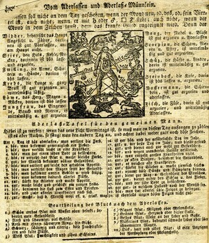 Kalender und Almanache waren bis zum 19. Jh. ein populäres Lektüremedium für breite Bevölkerungsschichten. Der Kaiserslauterner Hinkende Bote wurde von dem aus Sachsen stammenden Karl Heinrich Blau (1757-1824) verlegt, der 1802 die erste Druckerei in der Stadt eröffnete und auch den "Anzeiger von Kaiserslautern" herausgab. Wie bei Volkskalendern üblich, enthält der Hinkende Bote aus Kaiserslautern einen Kalender nach verschiedenen Zeitrechnungen und so genannte astrologische Praktika (auf Astrologie beruhende Wettervorhersagen), Anweisungen zum Aderlass, Termine für Messen und Märkte in der Region, Anekdoten, Leerseiten für eigene Eintragungen, historische Begebenheiten und politische Neuigkeiten. Die Ausgabe von 1812 enthält außerdem eine Genealogie der kaiserlichen Familie Frankreichs und einen Holzschnitt zur Geburt Napoleons. Kaiserslautern gehörte zu dieser Zeit zum Département du Mont-Tonnerre, einer nach französischem Vorbild geschaffenen Verwaltungseinheit im 1801/02 von den Franzosen annektierten linksrheinischen Gebiet. Das Titelblatt des Kaiserslauterners Kalenders bildet den namengebenden "Hinkenden Boten" ab: einen Mann mit Holzbein in Soldatenuniform. Häufig waren es invalide Soldaten, die versuchten, sich als Kolporteure von Nachrichten oder als Verkäufer von Volkskalendern ein Auskommen zu sichern. Die abgebildete Schnecke symbolisiert die Langsamkeit des Boten, die ihn jedoch gerade als eine vertrauenswürdige Quelle erscheinen ließ. Kalender mit "hinkenden Boten" im Titel waren vor allem im südwestdeutschen Raum, der Schweiz und dem Elsass verbreitet. [Johanna Kätzel]