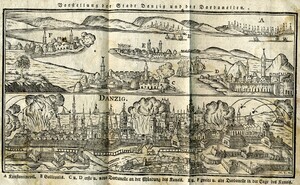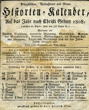 Der volkstümliche Kalender enthält Tabellen zu den verschiedenen Zeitrechnungssystemen (gregorianisch, jüdisch), Aufschlüsselung der verwendeten Symbole, Auflistung verschiedenster in der Vergangenheit liegender Ereignisse, Daten zu Sonnen- und Mond- Auf- bzw. Untergang, Finsternissen und Besonderheiten der Planeten, astrologische Praktika für das Jahr, Monatsseiten, Ratschläge zur Gartenarbeit und Leerseiten für persönliche Eintragungen. 30 Blätter, gedruckt und verlegt von K. H. Blau, Kaiserslautern. Holzschnitt des Hinkenden Boten: Links ist der namensgebende hinkende Bote mit Schnecke zu Füßen zu sehen. In Militärtracht, Lanze in der einen, Brief in der anderen Hand. Den Brief hält er in Richtung dreier vornehm gekleideter Personen. Im Hintergrund sind Kriegsszenen zu sehen. Über der Szene schwebt ein Posaune spielender Engel der in der linken Hand ein rundes Schild mit der Aufschrift „Der hinkende Bott“ trägt. Aus der Posaune heraus weht ein Banner mit der Aufschrift „Friede“. Holzschnitte der Stadt Danzig und der Dardanellen. Aderlasstafeln mit Aderlassmännlein.