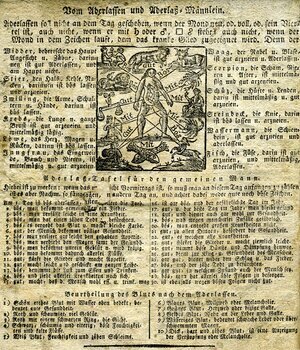 Kalender und Almanache waren bis zum 19. Jh. ein populäres Lektüremedium für breite Bevölkerungsschichten. Der Kaiserslauterner Hinkende Bote wurde von dem aus Sachsen stammenden Karl Heinrich Blau (1757-1824) verlegt, der 1802 die erste Druckerei in der Stadt eröffnete und auch den "Anzeiger von Kaiserslautern" herausgab. Wie bei Volkskalendern üblich, enthält der Hinkende Bote aus Kaiserslautern einen Kalender nach verschiedenen Zeitrechnungen und so genannte astrologische Praktika (auf Astrologie beruhende Wettervorhersagen), Anweisungen zum Aderlass, Termine für Messen und Märkte in der Region, Anekdoten, Leerseiten für eigene Eintragungen, historische Begebenheiten und politische Neuigkeiten. Die Ausgabe von 1811 enthält außerdem einen Holzschnitt mit dem Einzug von Napoleon I. und Marie-Louise von Österreich in Paris am 2. April 1810. Kaiserslautern gehörte bis 1814 zum Département du Mont-Tonnerre, einer nach französischem Vorbild geschaffenen Verwaltungseinheit im 1801/02 von den Franzosen annektierten linksrheinischen Gebiet. Das Titelblatt des Kaiserslauterners Kalenders bildet den namengebenden "Hinkenden Boten" ab: einen Mann mit Holzbein in Soldatenuniform. Häufig waren es invalide Soldaten, die versuchten, sich als Kolporteure von Nachrichten oder als Verkäufer von Volkskalendern ein Auskommen zu sichern. Die abgebildete Schnecke symbolisiert die Langsamkeit des Boten, die ihn jedoch gerade als eine vertrauenswürdige Quelle erscheinen ließ. Kalender mit "hinkenden Boten" im Titel waren vor allem im südwestdeutschen Raum, der Schweiz und dem Elsass verbreitet. [Johanna Kätzel]