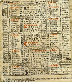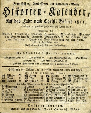Kalender und Almanache waren bis zum 19. Jh. ein populäres Lektüremedium für breite Bevölkerungsschichten. Der Kaiserslauterner Hinkende Bote wurde von dem aus Sachsen stammenden Karl Heinrich Blau (1757-1824) verlegt, der 1802 die erste Druckerei in der Stadt eröffnete und auch den "Anzeiger von Kaiserslautern" herausgab. Wie bei Volkskalendern üblich, enthält der Hinkende Bote aus Kaiserslautern einen Kalender nach verschiedenen Zeitrechnungen und so genannte astrologische Praktika (auf Astrologie beruhende Wettervorhersagen), Anweisungen zum Aderlass, Termine für Messen und Märkte in der Region, Anekdoten, Leerseiten für eigene Eintragungen, historische Begebenheiten und politische Neuigkeiten. Die Ausgabe von 1811 enthält außerdem einen Holzschnitt mit dem Einzug von Napoleon I. und Marie-Louise von Österreich in Paris am 2. April 1810. Kaiserslautern gehörte bis 1814 zum Département du Mont-Tonnerre, einer nach französischem Vorbild geschaffenen Verwaltungseinheit im 1801/02 von den Franzosen annektierten linksrheinischen Gebiet. Das Titelblatt des Kaiserslauterners Kalenders bildet den namengebenden "Hinkenden Boten" ab: einen Mann mit Holzbein in Soldatenuniform. Häufig waren es invalide Soldaten, die versuchten, sich als Kolporteure von Nachrichten oder als Verkäufer von Volkskalendern ein Auskommen zu sichern. Die abgebildete Schnecke symbolisiert die Langsamkeit des Boten, die ihn jedoch gerade als eine vertrauenswürdige Quelle erscheinen ließ. Kalender mit "hinkenden Boten" im Titel waren vor allem im südwestdeutschen Raum, der Schweiz und dem Elsass verbreitet. [Johanna Kätzel]