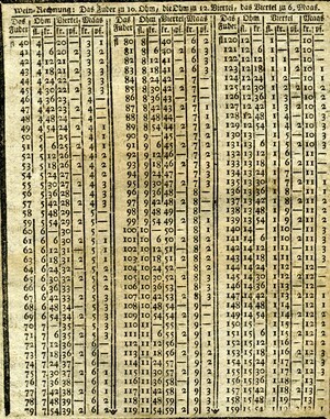 Der volkstümlicher Kalender enthält Tabellen zu den verschiedenen Zeitrechnungsarten (gregorianisch, jüdisch), Aufschlüsselung der verwendeten Symbole, Auflistung verschiedenster in der Vergangenheit liegender Ereignisse, Daten zu Sonnen- und Mond- Auf- bzw. Untergang, Finsternissen und Besonderheiten der Planeten, astrologische Praktika für das Jahr, Monatsseiten, Ratschläge zur Gartenarbeit und Leerseiten für persönliche Eintragungen. 32 Blätter. Gedruckt und verlegt von Jakob Bevern, Hof- und Kanzleidruckerei Bruchsal. Das Deckblatt ist in zwei unterschiedlich große Holzstiche aufgeteilt. Der untere und kleinere zeigt eine Ansicht der Stadt Bruchsal. Darüber steht auf einem langen, schmalen Banner „Hochfürstlich Speyerische Residenz-Stadt Bruchsal“. Im Zentrum des größeren Stichs sind sechs Personen, die in einem Halbkreis stehen. Aufgrund der Attribute in ihren Händen, wie z.B. eine Mondsichel und eine Sonne handelt es sich vermutlich um Personifikationen davon. Im Hintergrund sind je links und rechts zwei Säulenreihen zu sehen, die mit architektonischen Elementen, die an Rocaillen erinnern, geschmückt sind. In deren Mitte sind weitere astrologische Symbole, aus denen eine Deutung der Personen möglich ist. Es sind von links beginnend, die Symbole für Mond, Venus, Jupiter und Saturn. Oberhalb der Szene schwebt der Götterbote Merkur, zu erkennen an seinem Stab aus zwei umschlungenen Schlangen mit zwei Flügeln und weiteren Flügeln an den Füßen. In der Hand hält er ein großes Banner mit der Aufschrift „Neu-verbesserter Hochfürstlich Speyerischer Privilegirter Hof- Stadt- Land- und Geschichts-Calender“. Links von Merkur ist die Sonne, rechts der Mond im Sternenhimmel. Verzeichnis wann die Post in Bruchsal ankommt und abgeht. Umrechnungstabellen. Verzeichnis der Messen, Jahr- und Viehmärkte. Aderlasstafeln mit Aderlassmännlein.
