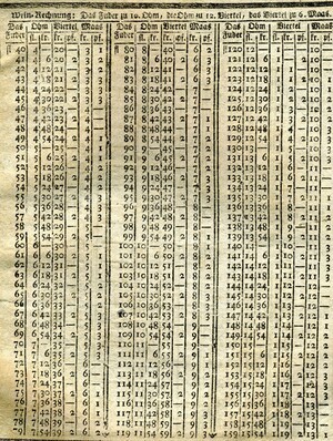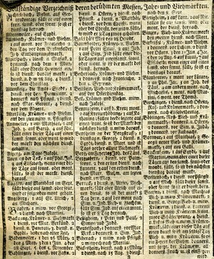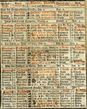 Der volkstümlicher Kalender enthält Tabellen zu den verschiedenen Zeitrechnungssystemen (gregorianisch, jüdisch), Aufschlüsselung der verwendeten Symbole, Auflistung verschiedenster in der Vergangenheit liegender Ereignisse, Daten zu Sonnen- und Mond- Auf- bzw. Untergang, Finsternissen und Besonderheiten der Planeten, astrologische Praktika für das Jahr, Monatsseiten, Ratschläge zur Gartenarbeit und Leerseiten für persönliche Eintragungen. 32 Blätter. Gedruckt und verlegt von Jakob Bevern, Hof- und Kanzleidruckerei Bruchsal. Das Deckblatt ist in zwei unterschiedlich große Holzstiche aufgeteilt. Der untere und kleinere zeigt eine Ansicht der Stadt Bruchsal. Darüber steht auf einem langen, schmalen Banner „Hochfürstlich Speyerische Residenz-Stadt Bruchsal“. Im Zentrum des größeren Stichs sind sechs Personen, die in einem Halbkreis stehen. Aufgrund der Attribute in ihren Händen, wie z.B. eine Mondsichel und eine Sonne handelt es sich vermutlich um Personifikationen. Im Hintergrund sind je links und rechts zwei Säulenreihen zu sehen, die mit architektonischen Elementen, die an Rocaillen erinnern geschmückt sind. In deren Mitte sind weitere astrologische Symbole, die eine Deutung der Personen ermöglichen. Es sind von links beginnend, die Symbole für Mond, Venus, Jupiter und Saturn. Oberhalb der Szene schwebt der Götterbote Merkur, zu erkennen an seinem Stab aus zwei umschlungenen Schlangen mit zwei Flügeln und weiteren Flügeln an den Füßen. In der Hand hält er ein großes Banner mit der Aufschrift „Neu-verbesserter Hochfürstlich Speyerischer Privilegirter Hof- Stadt- Land- und Geschichts-Calender“. Links von Merkur ist die Sonne, rechts der Mond im Sternenhimmel. Verzeichnis wann die Post in Bruchsal ankommt und abgeht. Verzeichnis der Mitglieder des Domstifts. Flüssigkeitsmaßtabellen (Fuder in Ohm) für Wein. Umrechnungstabellen. Verzeichnis der Messen, Jahr- und Viehmärkte. Aderlasstafeln mit Aderlassmännlein.