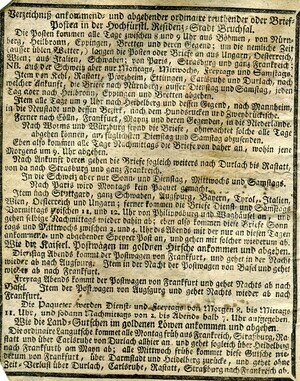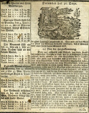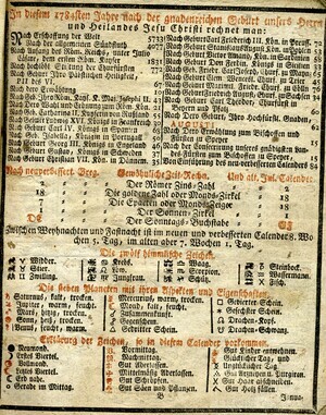 Der volkstümlicher Kalender enthält Tabellen zu den verschiedenen Zeitrechnungssystemen (gregorianisch, jüdisch), Aufschlüsselung der verwendeten Symbole, Auflistung verschiedenster in der Vergangenheit liegender Ereignisse, Daten zu Sonnen- und Mond- Auf- bzw. Untergang, Finsternissen und Besonderheiten der Planeten, astrologische Praktika für das Jahr, Monatsseiten, Ratschläge zur Gartenarbeit und Leerseiten für persönliche Eintragungen. 32 Blätter. Gedruckt und verlegt von Jakob Bevern, Hof- und Kanzleidruckerei Bruchsal. Das Deckblatt ist in zwei unterschiedlich große Holzstiche aufgeteilt. Der untere und kleinere zeigt eine Ansicht der Stadt Bruchsal. Darüber steht auf einem langen, schmalen Banner „Hochfürstlich Speyerische Residenz-Stadt Bruchsal“. Im Zentrum des größeren Stichs sind sechs Personen, die in einem Halbkreis stehen. Aufgrund der Attribute in ihren Händen, wie z.B. eine Mondsichel und eine Sonne handelt es sich vermutlich um Personifikationen. Im Hintergrund sind je links und rechts zwei Säulenreihen zu sehen, die mit architektonischen Elementen, die an Rocaillen erinnern geschmückt sind. In deren Mitte sind weitere astrologische Symbole, die eine Deutung der Personen ermöglichen. Es sind von links beginnend, die Symbole für Mond, Venus, Jupiter und Saturn. Oberhalb der Szene schwebt der Götterbote Merkur, zu erkennen an seinem Stab aus zwei umschlungenen Schlangen mit zwei Flügeln und weiteren Flügeln an den Füßen. In der Hand hält er ein großes Banner mit der Aufschrift „Neu-verbesserter Hochfürstlich Speyerischer Privilegirter Hof- Stadt- Land- und Geschichts-Calender“. Links von Merkur ist die Sonne, rechts der Mond im Sternenhimmel. Verzeichnis wann die Post in Bruchsal ankommt und abgeht. Verzeichnis der Mitglieder des Domstifts. Flüssigkeitsmaßtabellen (Fuder in Ohm) für Wein. Umrechnungstabellen. Verzeichnis der Messen, Jahr- und Viehmärkte. Aderlasstafeln mit Aderlassmännlein.