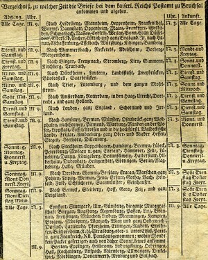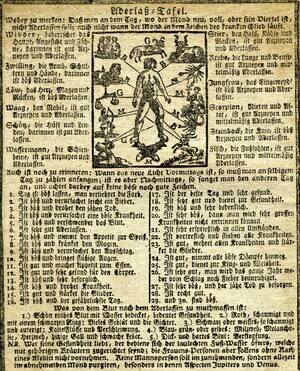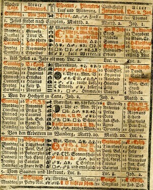 Der volkstümlicher Kalender enthält Tabellen zu den verschiedenen Zeitrechnungssystemen (gregorianisch, jüdisch), Aufschlüsselung der verwendeten Symbole, Auflistung verschiedenster in der Vergangenheit liegender Ereignisse, Daten zu Sonnen- und Mond- Auf- bzw. Untergang, Finsternissen und Besonderheiten der Planeten, astrologische Praktika für das Jahr, Monatsseiten, Ratschläge zur Gartenarbeit und Leerseiten für persönliche Eintragungen. 32 Blätter. Gedruckt und verlegt von Jakob Bevern, Hof- und Kanzleidruckerei Bruchsal. Das Deckblatt ist in zwei unterschiedlich große Holzstiche aufgeteilt. Der untere und kleinere zeigt eine Ansicht der Stadt Bruchsal. Darüber steht auf einem langen, schmalen Banner „Hochfürstlich Speyerische Residenz-Stadt Bruchsal“. Im Zentrum des größeren Stichs sind sechs Personen, die in einem Halbkreis stehen. Aufgrund der Attribute in ihren Händen, wie z.B. eine Mondsichel und eine Sonne handelt es sich vermutlich um Personifikationen. Im Hintergrund sind je links und rechts zwei Säulenreihen zu sehen, die mit architektonischen Elementen, die an Rocaillen erinnern, geschmückt sind. In deren Mitte sind weitere astrologische Symbole, die eine Deutung der Personen ermöglichen. Es sind von links beginnend, die Symbole für Mond, Venus, Jupiter und Saturn. Oberhalb der Szene schwebt der Götterbote Merkur, zu erkennen an seinem Stab aus zwei umschlungenen Schlangen mit zwei Flügeln und weiteren Flügeln an den Füßen. In der Hand hält er ein großes Banner mit der Aufschrift „Neu-verbesserter Hochfürstlich Speyerischer Privilegirter Hof- Stadt- Land- und Geschichts-Calender“. Links von Merkur ist die Sonne, rechts der Mond im Sternenhimmel. Verzeichnis wann die Post in Bruchsal ankommt und abgeht. Verzeichnis der Mitglieder des Domstifts. Flüssigkeitsmaßtabellen (Fuder in Ohm) für Wein. Umrechnungstabellen, Zinnstabellen. Verzeichnis der Messen, Jahr- und Viehmärkte. Aderlasstafeln mit Aderlassmännlein.