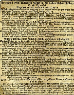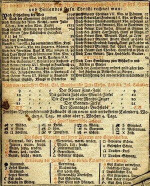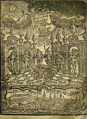 Der volkstümlicher Kalender enthält Tabellen zu den verschiedenen Zeitrechnungsarten (gregorianisch, jüdisch), Aufschlüsselung der verwendeten Symbole, Auflistung verschiedenster in der Vergangenheit liegender Ereignisse, Daten zu Sonnen- und Mond- Auf- bzw. Untergang, Finsternissen und Besonderheiten der Planeten, astrologische Praktika für das Jahr, Monatsseiten, Ratschläge zur Gartenarbeit und Leerseiten für persönliche Eintragungen. 32 Blätter. Gedruckt und verlegt von Jakob Bevern, Hof- und Kanzleidruckerei Bruchsal. Das Deckblatt ist in zwei unterschiedlich große Holzstiche aufgeteilt. Der untere und kleinere zeigt eine Ansicht der Stadt Bruchsal. Darüber steht auf einem langen, schmalen Banner „Hochfürstlich Speyerische Residenz-Stadt Bruchsal“. Im Zentrum des größeren Stichs sind sechs Personen, die in einem Halbkreis stehen. Aufgrund der Attribute in ihren Händen, wie z.B. eine Mondsichel und eine Sonne handelt es sich vermutlich um Personifikationen. Im Hintergrund sind je links und rechts zwei Säulenreihen zu sehen, die mit architektonischen Elementen, die an Rocaillen erinnern geschmückt sind. In deren Mitte sind weitere astrologische Symbole, die eine Deutung der Personen ermöglichen. Es sind von links beginnend, die Symbole für Mond, Venus, Jupiter und Saturn. Oberhalb der Szene schwebt der Götterbote Merkur, zu erkennen an seinem Stab aus zwei umschlungenen Schlangen mit zwei Flügeln und weiteren Flügeln an den Füßen. In der Hand hält er ein großes Banner mit der Aufschrift „Neu-verbesserter Hochfürstlich Speyerischer Privilegirter Hof- Stadt- Land- und Geschichts-Calender“. Links von Merkur ist die Sonne, rechts der Mond im Sternenhimmel. Verzeichnis wann die Post in Bruchsal ankommt und abgeht. Verzeichnis der Mitglieder des Domstifts. Flüssigkeitsmaßtabellen (Fuder in Ohm) für Wein. Umrechnungstabellen. Verzeichnis der Messen, Jahr- und Viehmärkte. Aderlasstafeln mit Aderlassmännlein.
