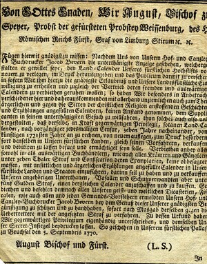 Hochfürstlicher Speyerischer Hof- ,Stadt-, Land- und Geschichtskalender für das Jahr 1776