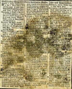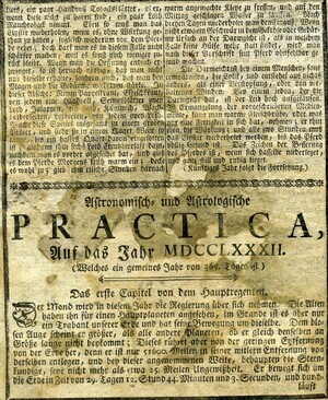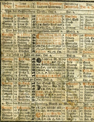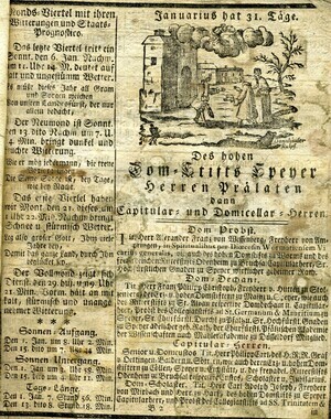 Landkalender mit Kupferstichen, Tabellen zu den verschiedenen Zeitrechnungsarten (gregorianisch, jüdisch), Aufschlüsselung der verwendeten Symbole, Auflistung verschiedenster in der Vergangenheit liegender Ereignisse, Daten zu Sonnen- und Mond- Auf- bzw. Untergang, Finsternissen und Besonderheiten der Planeten, astrologische Praktika für das Jahr, Monatsseiten, Ratschläge zur Gartenarbeit und Leerseiten für persönliche Eintragungen. 36 Blätter, z.T. restaurierungsbedürftig, gedruckt und vertrieben von Jacob Bevern , Hof- und Kanzleidrucker, Bruchsal. Das Deckblatt ist in zwei unterschiedlich große Holzstiche aufgeteilt. Der untere und kleinere zeigt eine Ansicht der Stadt Bruchsal. Darüber steht auf einem langen, schmalen Banner „Hochfürstlich Speyerische Residenz-Stadt Bruchsal“. Im Zentrum des größeren Stichs sind sechs Personen, die in einem Halbkreis stehen. Aufgrund der Attribute in ihren Händen, wie z.B. eine Mondsichel und eine Sonne handelt es sich vermutlich um Personifikationen. Im Hintergrund sind je links und rechts zwei Säulenreihen zu sehen, die mit architektonischen Elementen, die an Rocaillen erinnern geschmückt sind. In deren Mitte sind weitere astrologische Symbole, die eine Deutung der Personen ermöglichen. Es sind von links beginnend, die Symbole für Mond, Venus, Jupiter und Saturn. Oberhalb der Szene schwebt der Götterbote Merkur, zu erkennen an seinem Stab aus zwei umschlungenen Schlangen mit zwei Flügeln und weiteren Flügeln an den Füßen. In der Hand hält er ein großes Banner mit der Aufschrift „Neu-verbesserter Hochfürstlich Speyerischer Privilegirter Hof- Stadt- Land- und Geschichts-Calender“. Links von Merkur ist die Sonne, rechts der Mond im Sternenhimmel. Verzeichnis der Post- Ankunfts -und Abfahrten bezogen auf Bruchsal. Verzeichnis der Mitglieder des Domkapitel Speyer. Informationen über Pferdekrankheiten. Verzeichnis der Messen, Jahr- und Viehmärkte.