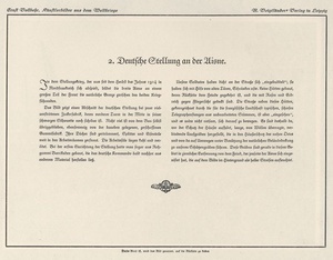 Kunstdruck mit dem Titel: "Deutsche Stellung an der Aisne"; Künster: Ernst Vollbehr; das Blatt ist Bestandteil einer Mappe von 18 Kunstdrucken mit dem Titel "Künstlerbilder aus dem Weltkriege. An der Westfront vor dem Feinde gemalt, von Ernst Vollbehr, Kriegs- und Kolonialmaler. Farbige Künstlerlithographien nach den Vollbehrschen Studien, ausgeführt in der Kunstdruckerei Künstlerbund, GmbH in Karlsruhe", herausgegeben von R. Voigtländers Verlag, Leipzig