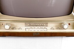 Graetz begann im Jahre 1925 mit der Produktion von Radios. Nach 1948 wurde die Firma, den politischen Verhältnissen entsprechend, in Ost und West aufgeteilt. Die Berliner Betriebsteile wurden enteignet und produzierten als VEB Graetz-Werk und ab 1950 als VEB Fernmeldewerk Treptow (RFT). Im Westen gründeten die Inhaber 1948 die Graetz KG in Altena/Westfalen und begannen wieder mit der Produktion von Radios. Es folgten Musiktruhen und Fernseher. 1961 verkaufte Erich Graetz das Unternehmen an die Standard Elektrik Lorenz (SEL) AG. Unser TV Modell „Burggraf“ aus dem Jahr 1960 hat ein in Hochglanz lackiertes Holzgehäuse. Die schwarz/weiss Bildröhre, mit allen Bedienteilen, ist eingebettet in einen elfenbeinfarbenen Plastikrahmen. Die Bedienung erfolgt über über klassische Drucktasten und Drehregler zur Einstellung der Bildverbesserung bzw. der Klangqualität. Der 22 Zoll große schwarz/weiss Bildschirm sorgte für ein gute Bildwiedergabe. Das Gerät konnte über eine Fernbedienung (Nr. 66424) gesteuert und für einen Mehrpreis von 20 DM, mit anschraubbaren Beinen geliefert werden. 1960 kostete der Fernseher 978 DM.