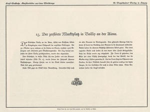 Kunstdruck mit dem Titel: "Der zerstörte Marktplatz in Vailly an der Aisne"; Künster: Ernst Vollbehr; das Blatt ist Bestandteil einer Mappe von 18 Kunstdrucken mit dem Titel "Künstlerbilder aus dem Weltkriege. An der Westfront vor dem Feinde gemalt, von Ernst Vollbehr, Kriegs- und Kolonialmaler. Farbige Künstlerlithographien nach den Vollbehrschen Studien, ausgeführt in der Kunstdruckerei Künstlerbund, GmbH in Karlsruhe", herausgegeben von R. Voigtländers Verlag, Leipzig