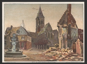 Kunstdruck mit dem Titel: "Der zerstörte Marktplatz in Vailly an der Aisne"; Künster: Ernst Vollbehr; das Blatt ist Bestandteil einer Mappe von 18 Kunstdrucken mit dem Titel "Künstlerbilder aus dem Weltkriege. An der Westfront vor dem Feinde gemalt, von Ernst Vollbehr, Kriegs- und Kolonialmaler. Farbige Künstlerlithographien nach den Vollbehrschen Studien, ausgeführt in der Kunstdruckerei Künstlerbund, GmbH in Karlsruhe", herausgegeben von R. Voigtländers Verlag, Leipzig