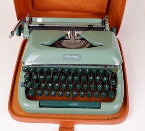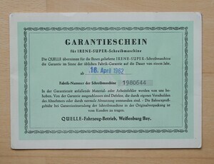 Quelle war eine reine Vertriebsfirma. Schreibmaschinen wurden größtenteils in der DDR gekauft und unter dem Namen ""Quelle"" in Westdeutschland vertrieben. So auch unsere Kleinschreibmaschine Quelle "Irene Super" . Im Grunde genommen ist das Modell ein Nachfolger der legendären "Erika" des traditionsreichen Schreibmaschinen Herstellers Seidel & Neumann aus Dresden, der nach 1945 in Volkseigentum (Schreibmaschinenwerk Dresden) überführt wurde. Unsere Maschine wurde 1962, unter der Produktionsnummer 1980644, in der DDR hergestellt und in einem sandfarbenen (Leder) Koffer ausgeliefert. Ausgerüstet ist sie mit einem Tabulator, einem Typenhebelentwirrer und Wagenfeststeller. Durch das Lösen von zwei Sperrhaken lässt sich „IRENA“ aus dem Koffer heben. Technisch handelt es sich um eine Typenhebelschreibmaschine mit Wagnergetriebe. Der noch erhalten gebliebene Garantieschein bezeugt den Kauf vom 16.April 1962. Zusammen mit der Gebrauchsanweisung, liegt er der Maschine bei.