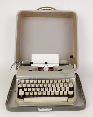Die Firma hatte ihren Ursprung in der Berliner Firma AEG. Das erste erfolgreiche Modell (1903) war die preiswerte Zeigerschreibmaschine „Mignon“. Die nachfolgenden Modelle wurden unter dem Namen "Olympia" vermarktet. 1936 erfolgte die Umbenennung in "Olympia Büromaschinen-Werke AG". Im 2. Weltkrieg produzierte das Unternehmen die Chiffriermaschine ENIGMA. Nach 1945 erfolgte, parallel zur politischen Lage, eine Teilung in "Ost" und "West": Die Geschäftsleitung zog in den Westen, nach Wilhelmshaven, und gründete die neuen "Olympia Werke", während aus den Überresten des Werks in Erfurt ein volkseigener Betrieb (VEB) der DDR geformt wurde, die "Optima Büromaschinenwerke". Unsere Olympia Monica stammt zwar aus Wilhelmshaven, jedoch ist micht sichergestellt, ob sie dort auch produziert wurde. Denn seit 1979 wurden Maschinen von unterschiedlichen Firmen dazu gekauft und lediglich mit einem Olympia Gehäuse versehen. Ihr Transportkoffer besteht aus Holz und ist mit einem Lederimitat bezogen. Für den stationären Einsatz lässt sich die Maschine per Kipphebel aus der Verankerung des Koffers lösen. Die Maschine verfügt über eine Tastensperre und Zeilenschaltung. Technisch handelt es sich um eine Typenhebelschreibmaschine mit Wagnergetriebe und 4 reihiger, deutscher Q W E R T Tastatur .