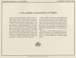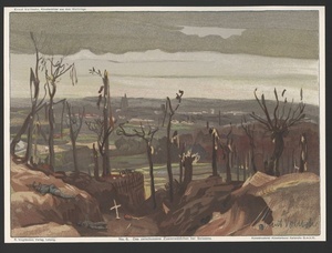 Kunstdruck mit dem Titel: "Das zerschossene Zuavenwäldchen bei Soissons"; Künster: Ernst Vollbehr; das Blatt ist Bestandteil einer Mappe von 18 Kunstdrucken mit dem Titel "Künstlerbilder aus dem Weltkriege. An der Westfront vor dem Feinde gemalt, von Ernst Vollbehr, Kriegs- und Kolonialmaler. Farbige Künstlerlithographien nach den Vollbehrschen Studien, ausgeführt in der Kunstdruckerei Künstlerbund, GmbH in Karlsruhe", herausgegeben von R. Voigtländers Verlag, Leipzig