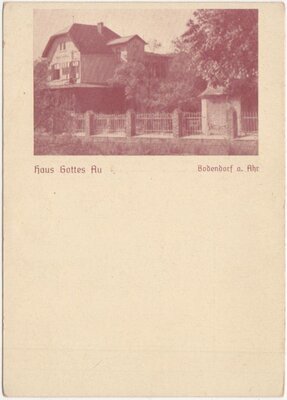 Karte im Querformat, Rand glatt und Sepiadruck. Vorderseite: Foto mit Außenansicht der Pension. Vorn rechts die St. Anna Kapelle. Inter Bild steht "Haus Gottes Aua Bodendorf a. Ahr" Rückseite ist vorgesehen für den Eintrag von Empfängeradresse (rechts) und Text (links).