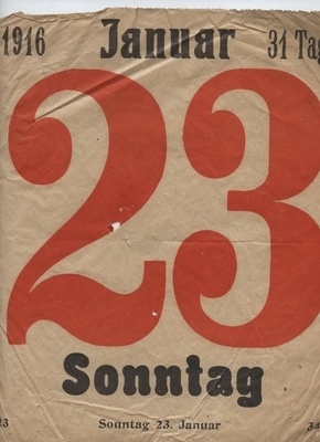 Kalenderblätter eines Abreißkalenders: Sonntag, den 23. Januar 1916 (HM_0_13048) Dienstag, den 15. Februar 1916 (HM_0_13049) Dienstag, den 22. Februar 1916 (HM_0_13050) Freitag, den 25. Februar 1916 (HM_0_13051) Samstag, den 26. Februar 1916 (HM_0_13052) Montag, den 28. Februar 1916 (HM_0_13053) Donnerstag, den 9. März 1916 (HM_0_13054) Freitag, den 10. März 1916 (HM_0_13055) Samstag, den 11. März 1916 (HM_0_13056) Donnerstag, den 16. März 1916 (HM_0_13057) Freitag, den 17. März 1916 (HM_0_13058) Samstag, den 18. März 1916 (HM_0_13059) Mittwoch, den 22. März 1916 (HM_0_13060) Donnerstag, den 23. März 1916 (HM_0_13061) Freitag, den 24. März 1916 (HM_0_13062) Samstag, den 25. März 1916 (HM_0_13063)