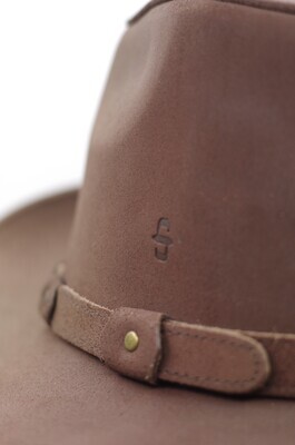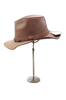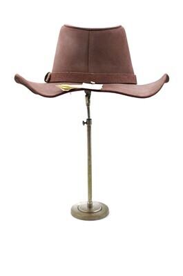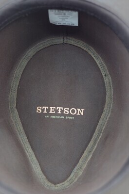 Dieser Herrenhut des amerikanischen Herstellers im Wild-West-Look spiegelt mit seiner Cowboyform den Firmenpathos wieder. Er ist aus braunem, mattem Leder gefertigt, das leicht angeraut ist. Die Krempe ist wellig und biegsam, sodass sie beliebig geformt werden kann. Sie ist underwelt verarbeitet. Um die Krone verläuft ein schmales Hutband, das aus dem gleichen Leder besteht und zu den Kanten hin abgesteppt ist. Es verläuft durch sechseckige Schlaufen, an denen es je mit einer messingfarbenen Niete fixiert ist, wobei das Band leicht eingekniffen wird. An der linken Seite befindet sich eine größere Schlaufe. Auch Sie ist mit einer Niete mit dem Band verbunden, dass kurz hinter der Schlaufe rund endet. Über ihr ist die Krone brandzeichenähnlich mit dem Stetson 'S' gebrandet. Die Krone ist an der Hinterseite mit einer einfach abgesteppten, überlappenden Naht geschlossen. Das Schweißband im Inneren, ist aus schräg geschnittenem Köper, mit Einlage unterlegt und zu den Seiten abgesteppt. Die Naht des Schweißbandes schließt leicht versetzt von der Hinteren Mitte. Die Naht der Krone ist wie beschrieben einfach abgesteppt. Das Dach ist mit einer Doppelten Steppnaht eingesetzt. In der Hinteren Mitte befindet sich ein Etikett mit den handelsüblichen Angaben. Im Kronendach ist in matten, orangenen Lettern der Firmenname 'Stetson' gedruckt. Darunter ist noch, in grünlichen Lettern der Zusatz 'An American Spirit' zu finden. Hinten an der Oberseite der Krempe findet sich ein Pappkatalog mit Hinweisen zur Firmengeschichte und zur Lederpflege. Das Modell ist einmal vorhanden. Es hat die Größenangabe XL. Obwohl dieser Hut im Schaufenster ausgestellt ist, finden sich keine nennenswerten Schäden, wie Sie bei anderen Exponaten, die im Schaufenster ausgestellt sind.