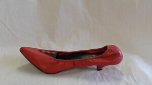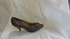 Ein Paar Pumps aus dunkelblauem Leder. Spitze Form, mit Leder bezogener und metallgenagelter Absatz (ca. 3,5cm). Die Schuhe sind mit Zierlochungen versehen. Datiert auf 1969. Schuhe dieser Art wurden als Tanzschuhe für Rock´n Roll und ähnlich bewegungsintensive Tänze konzipiert. Sie verfügen über ein eingefasstes Gummiband, welches die Schuhe am Fuß halten soll.