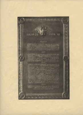 Fotografische Reproduktion zweier Gedenktafeln zur Erinnerung an die Gefallenen der Kriege von 1870/71 und 1914-18 mit begleitendem Text