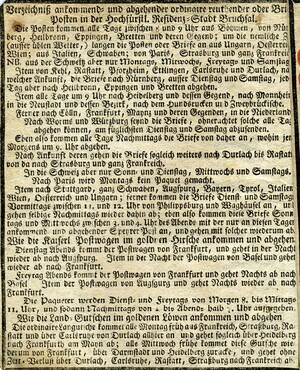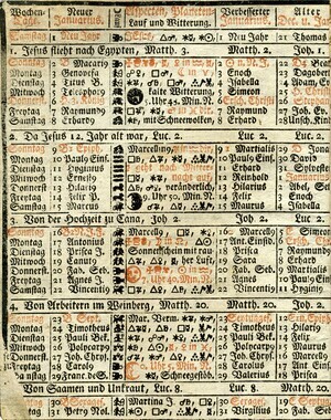 Der volkstümliche Kalender enthält Tabellen zu den verschiedenen Zeitrechnungsarten (gregorianisch, jüdisch), Aufschlüsselung der verwendeten Symbole, Auflistung verschiedenster in der Vergangenheit liegender Ereignisse, Daten zu Sonnen- und Mond- Auf- bzw. Untergang, Finsternissen und Besonderheiten der Planeten, astrologische Praktika für das Jahr, Monatsseiten, Ratschläge zur Gartenarbeit und Leerseiten für persönliche Eintragungen. 36 Blätter, gedruckt von Jacob Bevern, Hof- und Kanzleidruckerei Bruchsal. Das Deckblatt ist in zwei unterschiedlich große Holzstiche aufgeteilt. Der untere und kleinere zeigt eine Ansicht der Stadt Bruchsal. Darüber steht auf einem langen, schmalen Banner „Hochfürstlich Speyerische Residenz-Stadt Bruchsal“. Im Zentrum des größeren Stichs sind sechs Personen, die in einem Halbkreis stehen. Aufgrund der Attribute in ihren Händen, wie z.B. eine Mondsichel und eine Sonne handelt es sich vermutlich um Personifikationen. Im Hintergrund sind je links und rechts zwei Säulenreihen zu sehen, die mit architektonischen Elementen, die an Rocaillen erinnern geschmückt sind. In deren Mitte sind weitere astrologische Symbole, die eine Deutung der Personen ermöglichen. Es sind von links beginnend, die Symbole für Mond, Venus, Jupiter und Saturn. Oberhalb der Szene schwebt der Götterbote Merkur, zu erkennen an seinem Stab aus zwei umschlungenen Schlangen mit zwei Flügeln und weiteren Flügeln an den Füßen. In der Hand hält er ein großes Banner mit der Aufschrift „Neu-verbesserter Hochfürstlich Speyerischer Privilegirter Hof- Stadt- Land- und Geschichts-Calender“. Links von Merkur ist die Sonne, rechts der Mond im Sternenhimmel. Verzeichnis wann die Post in Bruchsal ankommt und abgeht. Schreiben des Bischofs Verzeichnis der Mitglieder des Domstifts. Flüssigkeitsmaßtabellen (Fuder in Ohm) für Wein. Umrechnungstabellen. Verzeichnis der Messen, Jahr- und Viehmärkte. Aderlasstabellen. Pferde-Krankheiten
