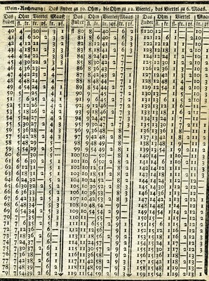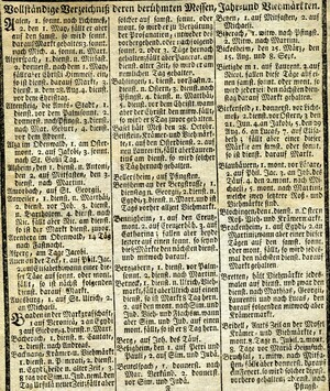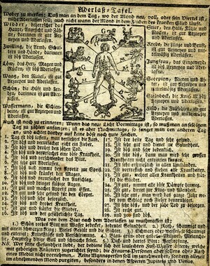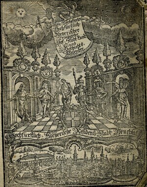 Der volkstümliche Kalender enthält Tabellen zu den verschiedenen Zeitrechnungsarten (gregorianisch, jüdisch), Aufschlüsselung der verwendeten Symbole, Auflistung verschiedenster in der Vergangenheit liegender Ereignisse, Daten zu Sonnen- und Mond- Auf- bzw. Untergang, Finsternissen und Besonderheiten der Planeten, astrologische Praktika für das Jahr, Monatsseiten, Ratschläge zur Gartenarbeit und Leerseiten für persönliche Eintragungen. 36 Blätter, gedruckt von Jacob Bevern, Hof- und Kanzleidruckerei Bruchsal. Das Deckblatt ist in zwei unterschiedlich große Holzstiche aufgeteilt. Der untere und kleinere zeigt eine Ansicht der Stadt Bruchsal. Darüber steht auf einem langen, schmalen Banner „Hochfürstlich Speyerische Residenz-Stadt Bruchsal“. Im Zentrum des größeren Stichs sind sechs Personen, die in einem Halbkreis stehen. Aufgrund der Attribute in ihren Händen, wie z.B. eine Mondsichel und eine Sonne handelt es sich vermutlich um Personifikationen. Im Hintergrund sind je links und rechts zwei Säulenreihen zu sehen, die mit architektonischen Elementen, die an Rocaillen erinnern geschmückt sind. In deren Mitte sind weitere astrologische Symbole, die eine Deutung der Personen ermöglichen. Es sind von links beginnend, die Symbole für Mond, Venus, Jupiter und Saturn. Oberhalb der Szene schwebt der Götterbote Merkur, zu erkennen an seinem Stab aus zwei umschlungenen Schlangen mit zwei Flügeln und weiteren Flügeln an den Füßen. In der Hand hält er ein großes Banner mit der Aufschrift „Neu-verbesserter Hochfürstlich Speyerischer Privilegirter Hof- Stadt- Land- und Geschichts-Calender“. Links von Merkur ist die Sonne, rechts der Mond im Sternenhimmel. Verzeichnis wann die Post in Bruchsal ankommt und abgeht. Schreiben des Bischofs Verzeichnis der Mitglieder des Domstifts. Flüssigkeitsmaßtabellen (Fuder in Ohm) für Wein. Umrechnungstabellen. Verzeichnis der Messen, Jahr- und Viehmärkte. Aderlasstabellen. Pferde-Krankheiten